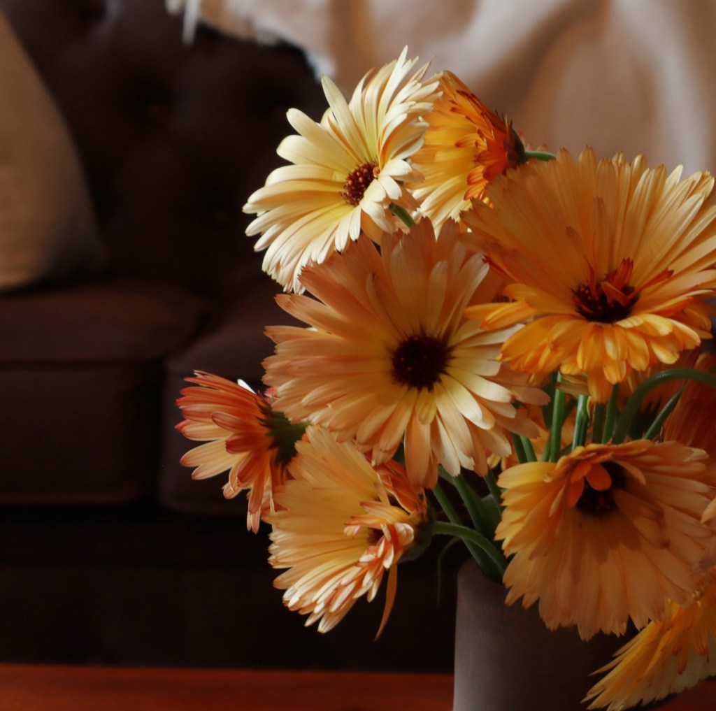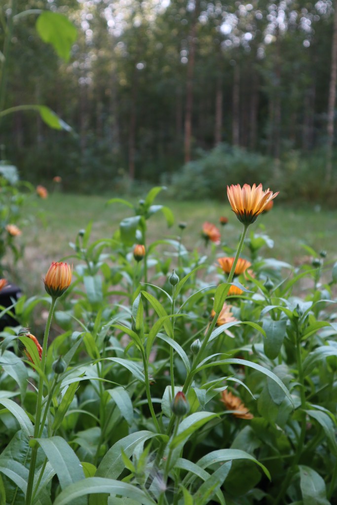 Kehäkukkien kukinta alkoi elokuun alussa ja jatkuu edelleen (lokakuun alkua siis eletään). Katkoin suurimman osan viime viikolla mahdollista kehäkukkavoiteen valmistusta varten ja halusin myös sisälle pienen kimpun. Muutaman jätin vielä kehikkoon kukkimaan. Parhaan kukkaloiston saat, kun kasvatat kehäkukkia aurinkoisella paikalla.