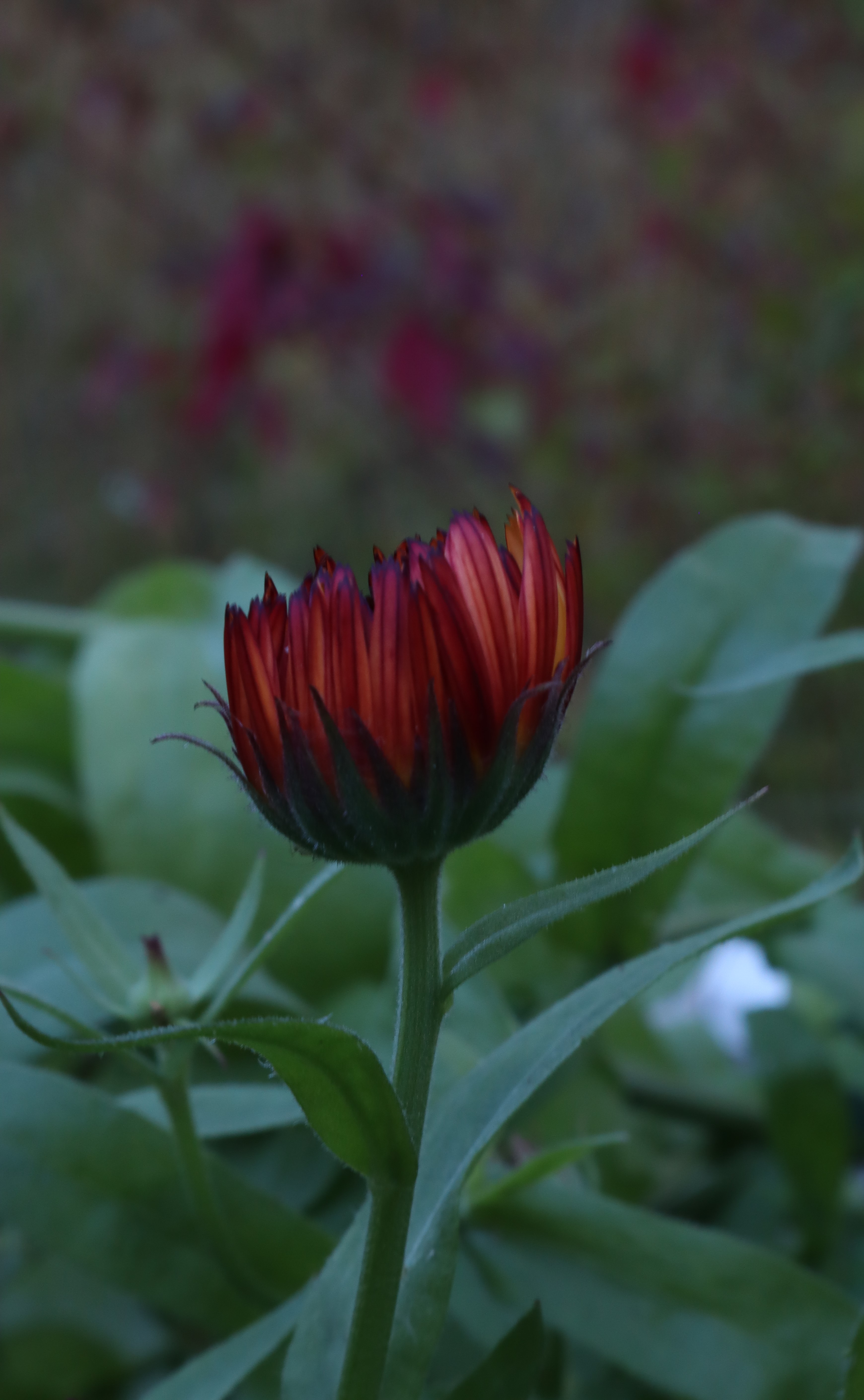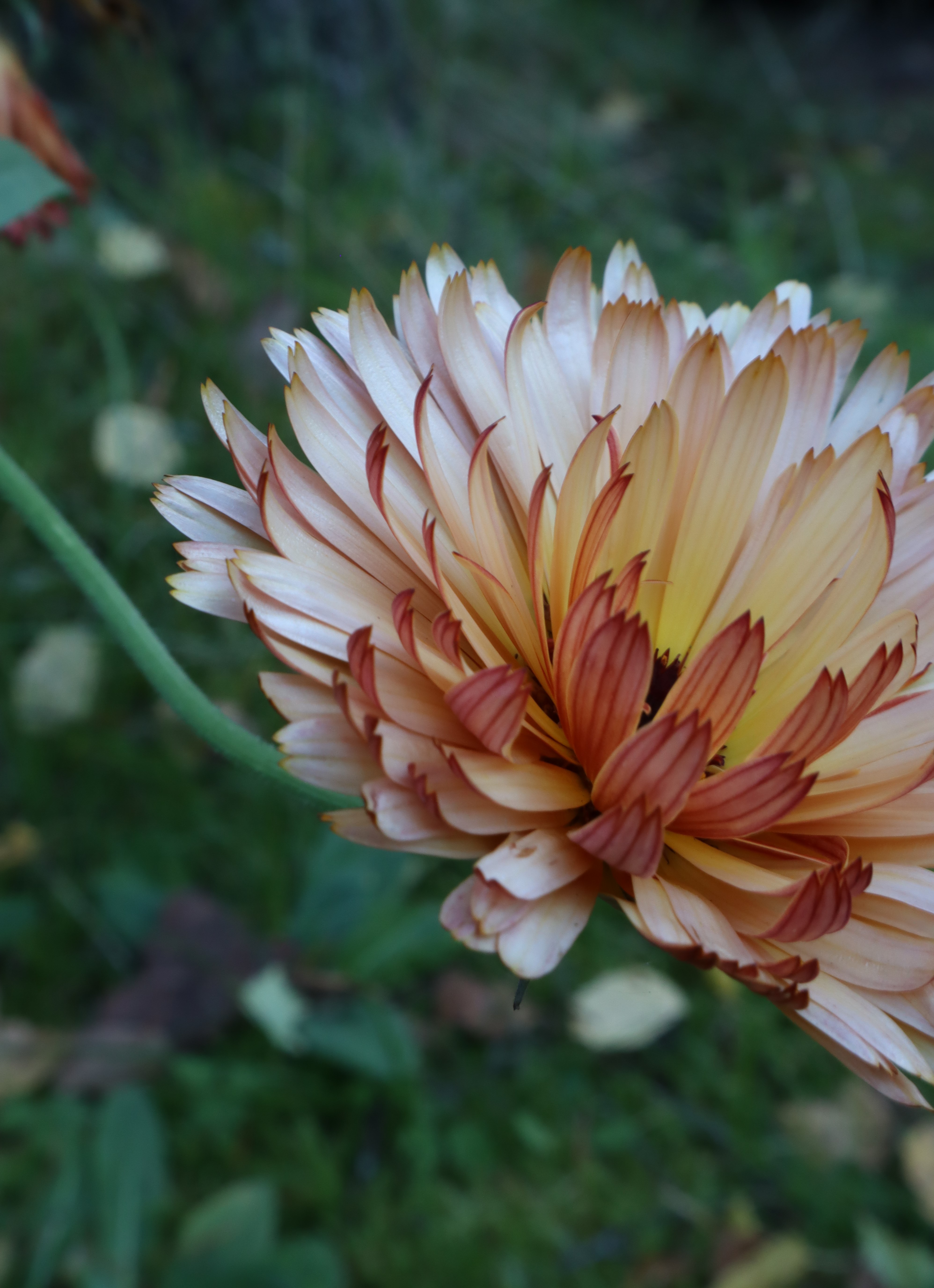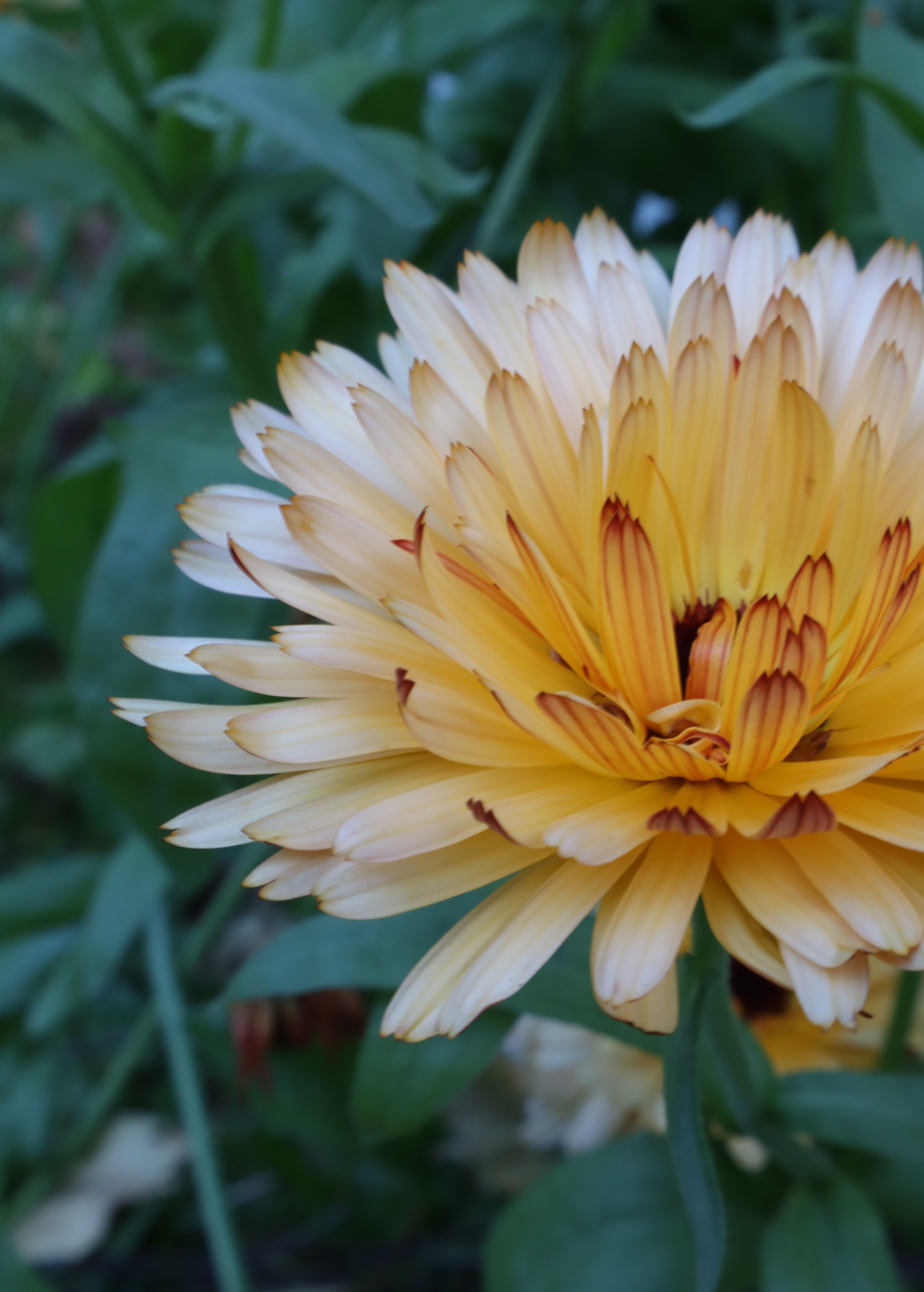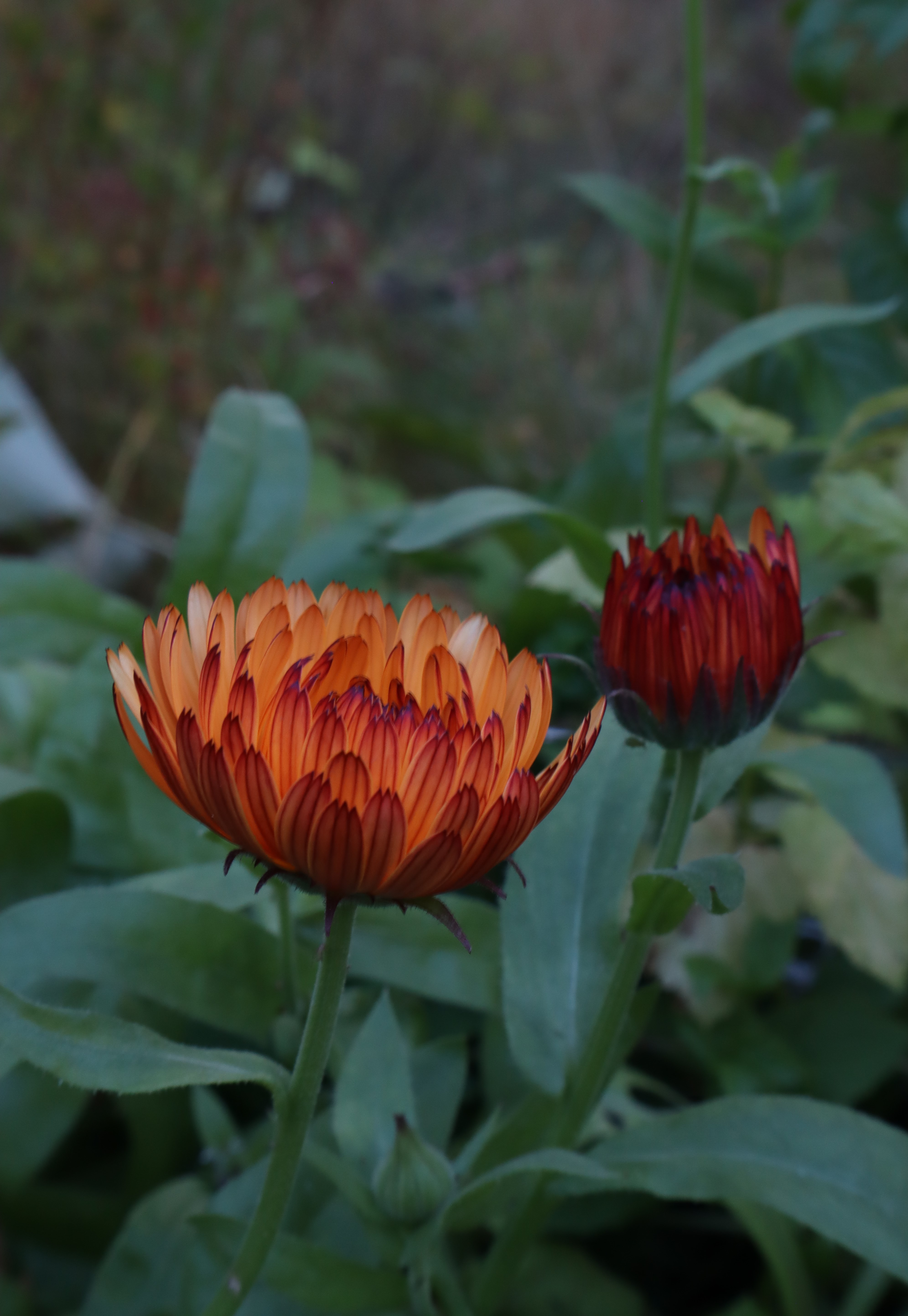 Kehäkukan terälehdet ovat alapuolelta tummemmat ja kiinni ollessaan kukka näyttääkin ruosteisen oranssilta tai syvän punaiselta.