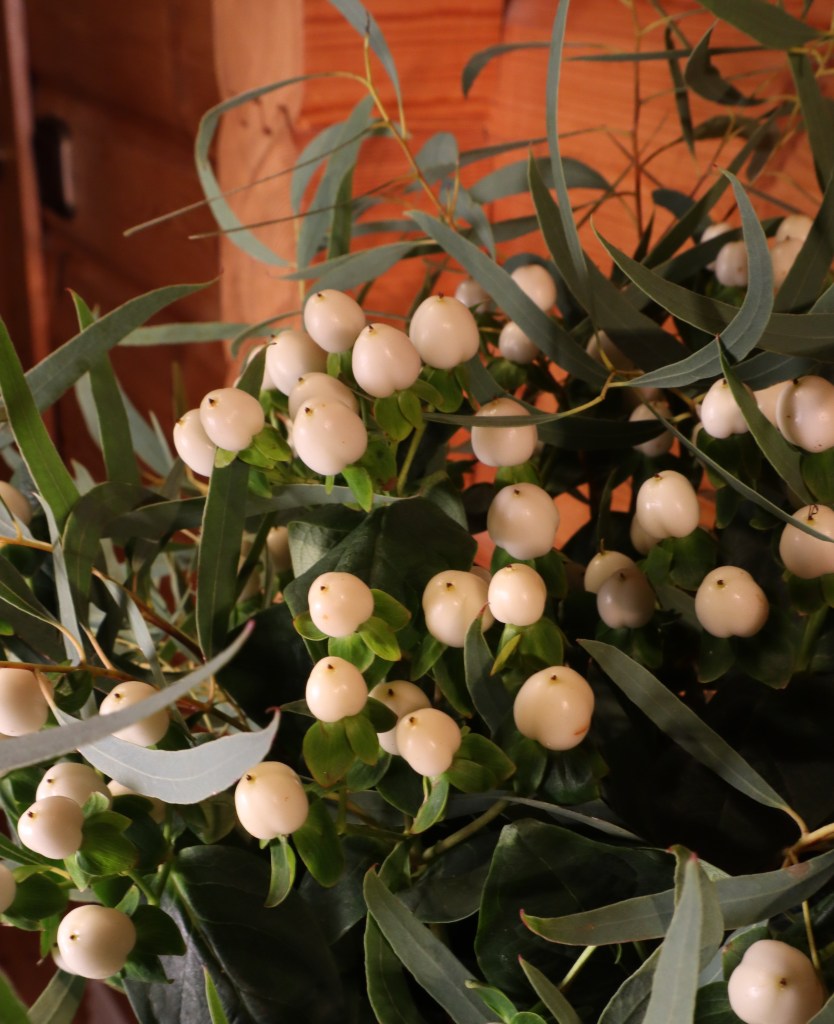 Toiseen maljakkoon laitoin valkoisen marjakuisman lisäksi eukalyptusta (Eucalyptus nicholii). Sen pitkulaiset, hopeanharmaat lehdet sopivat täydellisesti kermanvalkoisten marjojen kanssa ja tuovat asetelmaan kauniisti rönsyilevää rakennetta.