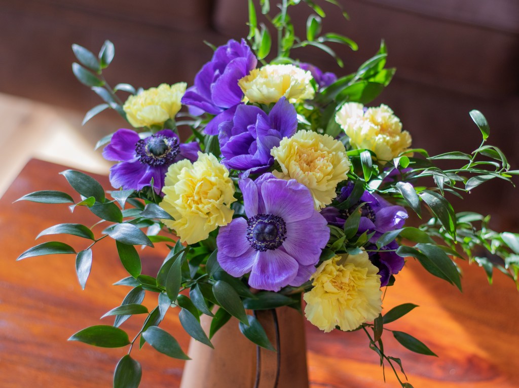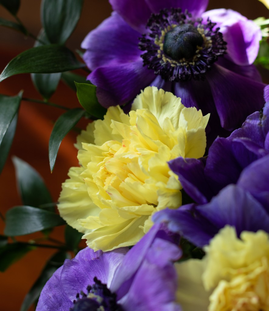Mä olen ihan hullaantunut kruunuvuokkoihin. Mulla on fuksianpunaista ruukussa ja nyt halusin violettia maljakkoon. Ne ovat mun mielestä todella kauniita pelkästäänkin, mutta lisäsin joukkoon vähän ruskusta.