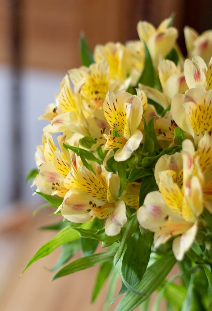 Toiseksi keltasävyiseksi kukaksi valitsin inkaliljan. Sen kukat ovat mielenkiintoisen kirjavia. Niissä ei ole mun makuuni liikaa kirkuvan kirkasta keltaista, vaan niiden sävy on suurimmaksi osaksi pehmeämpi niin kuin valitsemissani neilikoissakin.