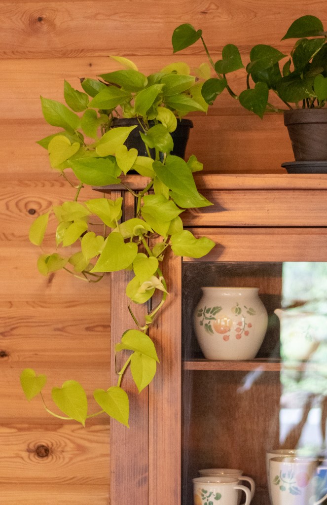 Mulla on kolme kultaköynnöstä, limenvihreä ja kaksi tummanvihreää. Sain limenvihreän viime syksynä ja laitoin sen olohuoneen vitriinin päälle paikkaan, johon tulee varsinkin talviaikaan hyvin vähän valoa. Epäilin sen pärjäämistä, mutta turhaan! Se pysyi loistavassa kunnossa talven yli ja on kasvanut nopeasti kevättalven ja kevään mittaan. Olin sen pärjäämisestä todella yllättynyt. Luulin, että lehdistö olisi pimeydestä edes hieman kärsinyt, mutta taisin koko talven aikana poistaa siitä vain yhden nuupahtaneen lehden.