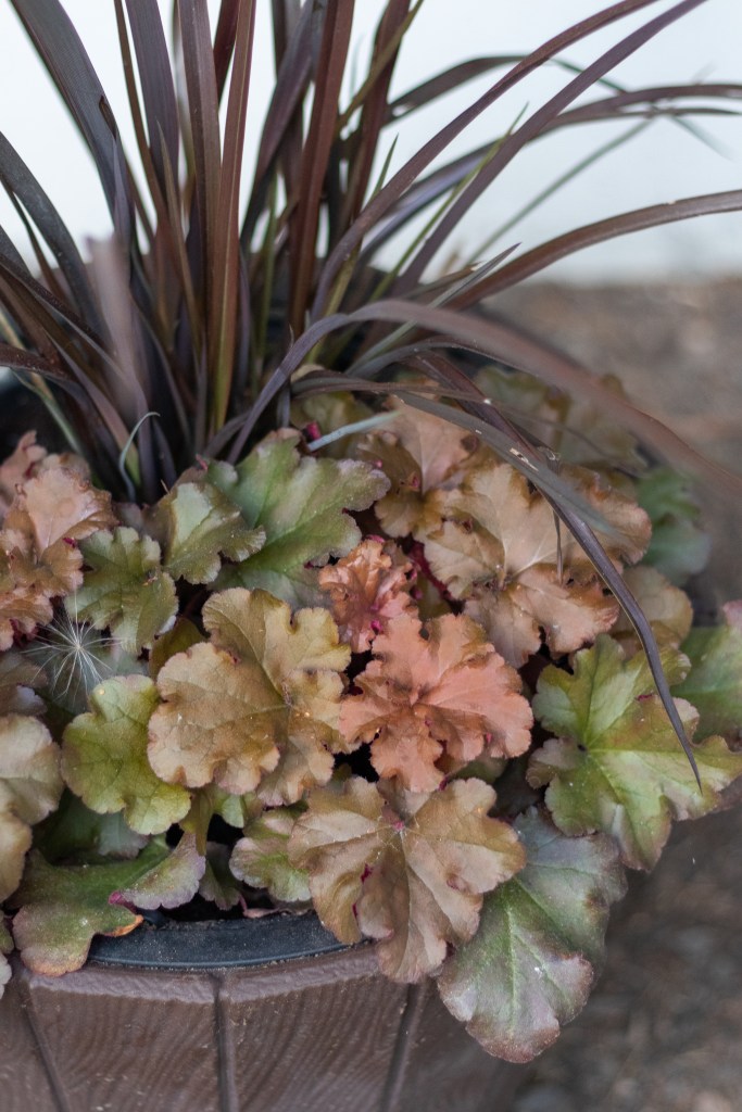Toisessa isossa ruukussa mulla oli kesän ajan purppurasulkahirssi ja kaksi tähtisilmää. Tähtisilmien oli nyt aika lähteä ja istutin purppurahirssin seuraksi kolme keijunkukka Caramelia.