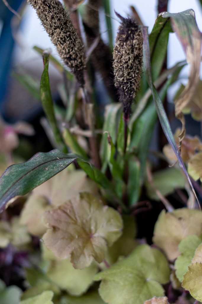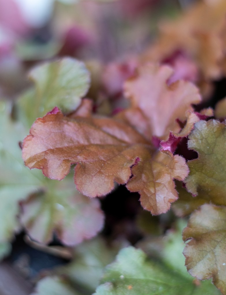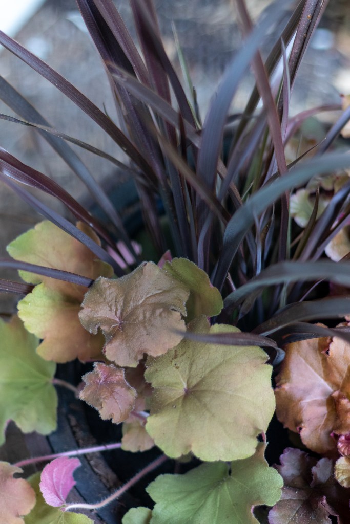 Lisäsin nyt tuohon asetelmaan vielä tarhakeijunkukka Caramelin. Sen nukan peittämät lehdet näyttävät suloisen pehmeiltä ja värit mukailevat Boysenberryn värejä, mutta ovat hieman hempeämmän sävyisiä. Molemmat keijunkukkalajikkeet viihtyvät puolivarjossa tai auringossa, mutta eivät kovassa paahteessa. Ne ovat monivuotisia perennoja ja siirränkin ne myöhemmin syksyllä maahan talvehtimaan.