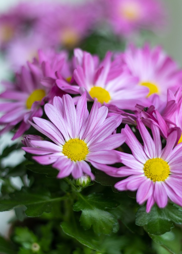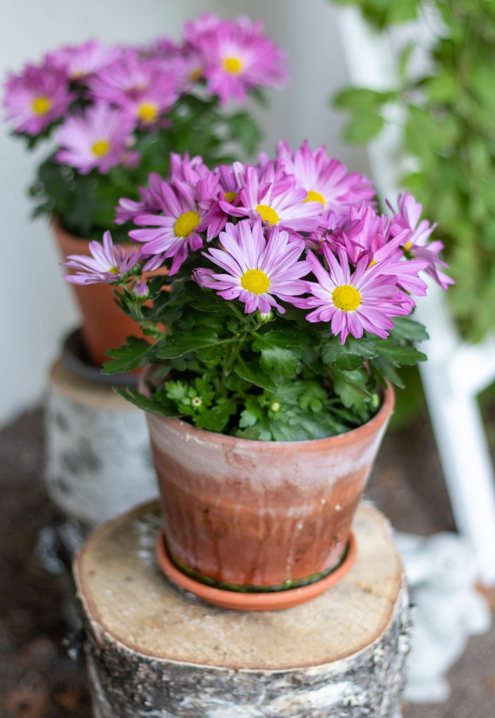 Etupihan pelargonit alkavat olla jo kukkimisensa kukkineet, joten laitoin ruukkuihin niiden tilalle raikkaan liiloja krysanteemeja väriä tuomaan. Lajike- ja värivalikoimaa krysanteemeista löytyy todella runsaasti ja ne sopivat myös sisällä kasvatettaviksi.