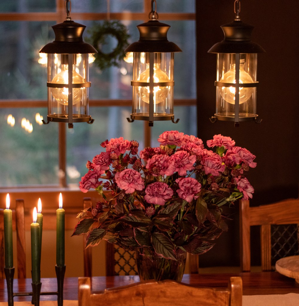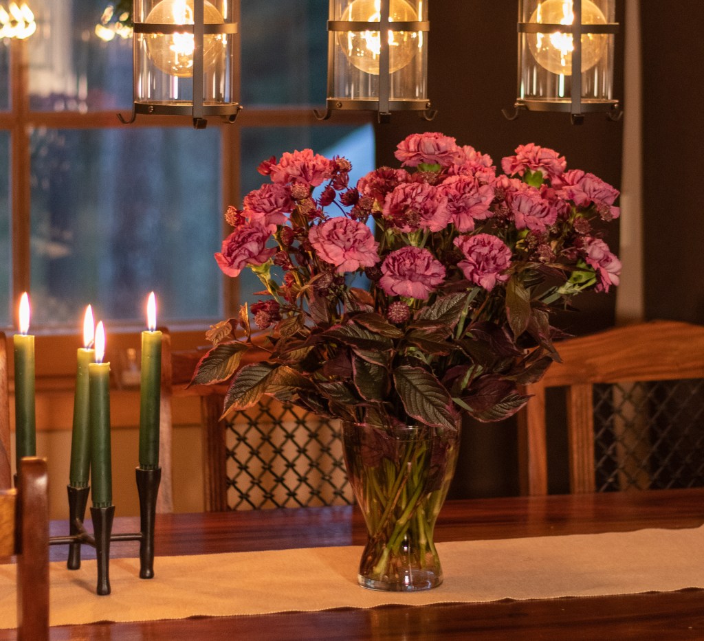 Sain Huiskulasta neilikoita, isotähtiputkia ja kotakuusamaa. Niiden värit sointuvat kauniisti yhteen ja ne kestävät tosi pitkään maljakossa. Halusin leikkoja, jotka pysyvät kauniina vähintään viikon ja tiesin, että näihin voi luottaa. Neilikoille kun leikkaa välillä uudet imupinnat ja vaihtaa puhtaan veden, voivat ne säilyä hyvännäköisinä useammankin viikon.