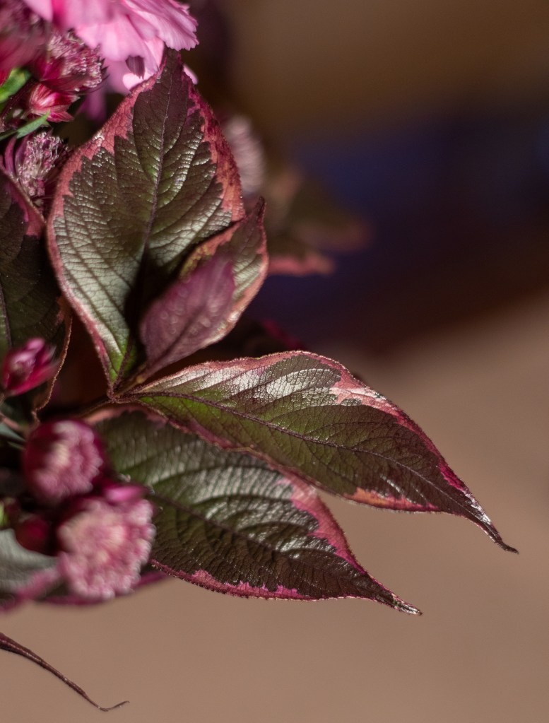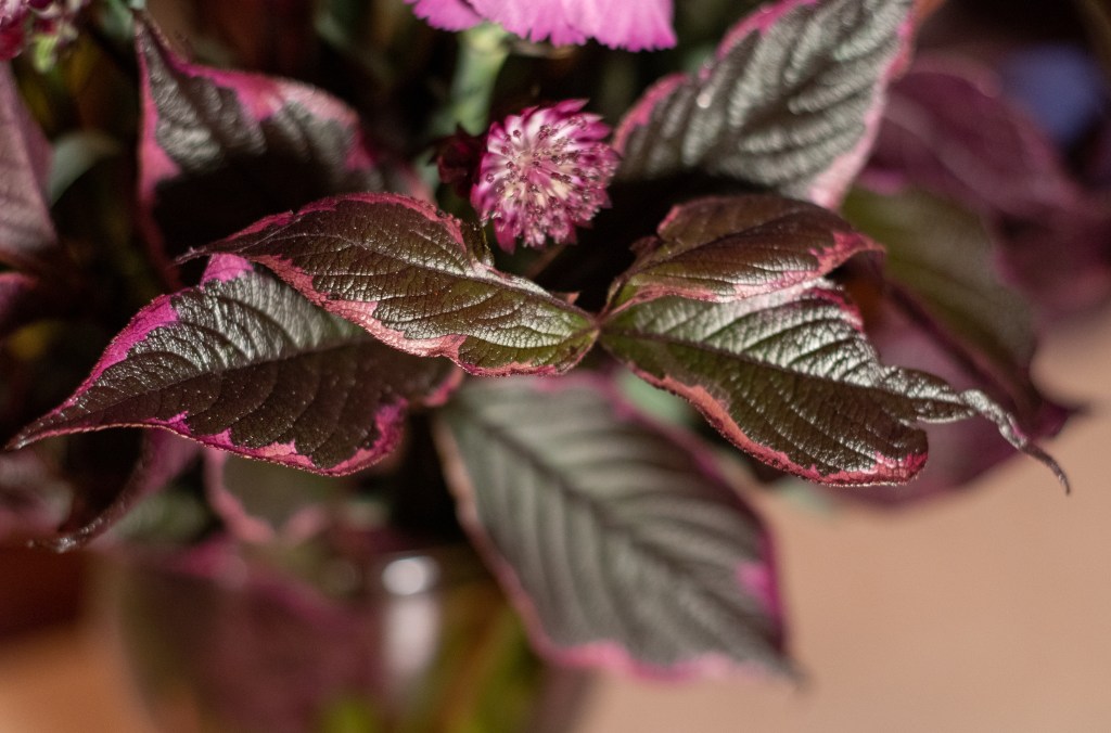 Tykkään useimmiten lisätä kimppuihin myös jotakin vihreää ja tällä kertaa löytyikin oikein näyttävä lisä juuri tähän kimppuun. Kotakuusaman syvän tummanvihreiden lehtien violetti reuna toistaa kauniisti kukkien sävyjä.