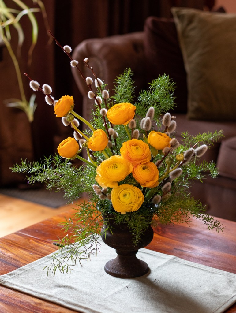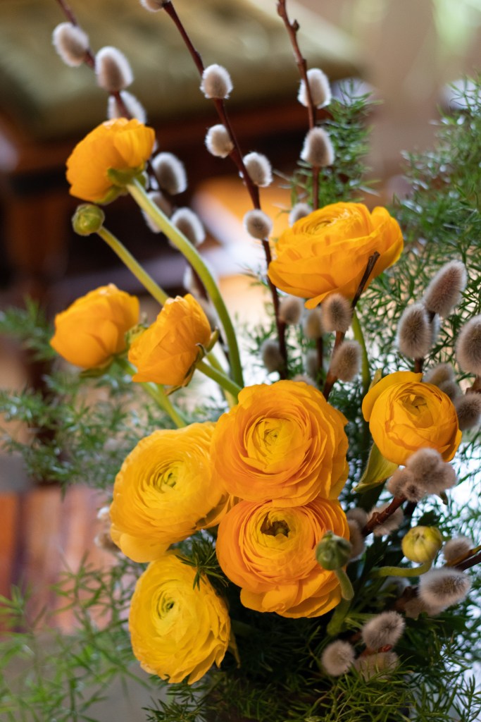 Mä halusin tehdä Suomen luonnosta muistuttavan, yksinkertaisen asetelman. Pirtsakan keltaiset jaloleinikit tuovat mieleen niittykulleron, sarjaparsa on katajamainen ja pajunkissat tietysti kuuluvat tähän vaiheeseen kevättä luonnossakin.