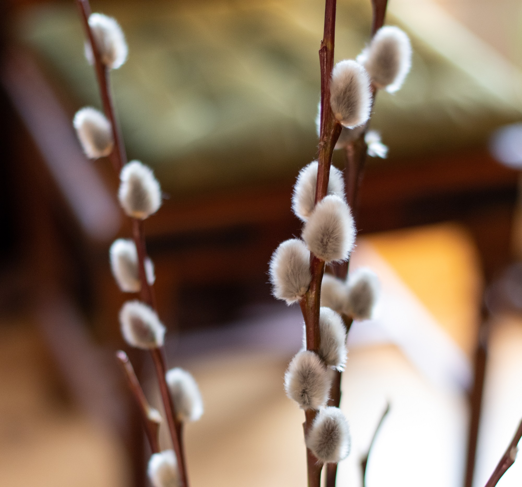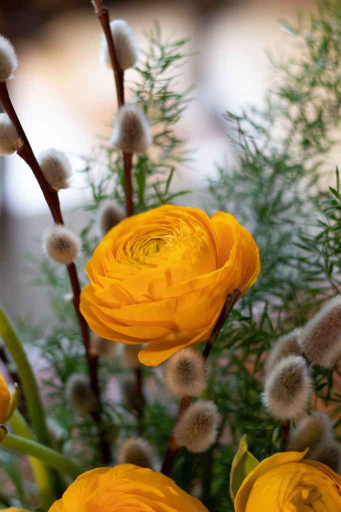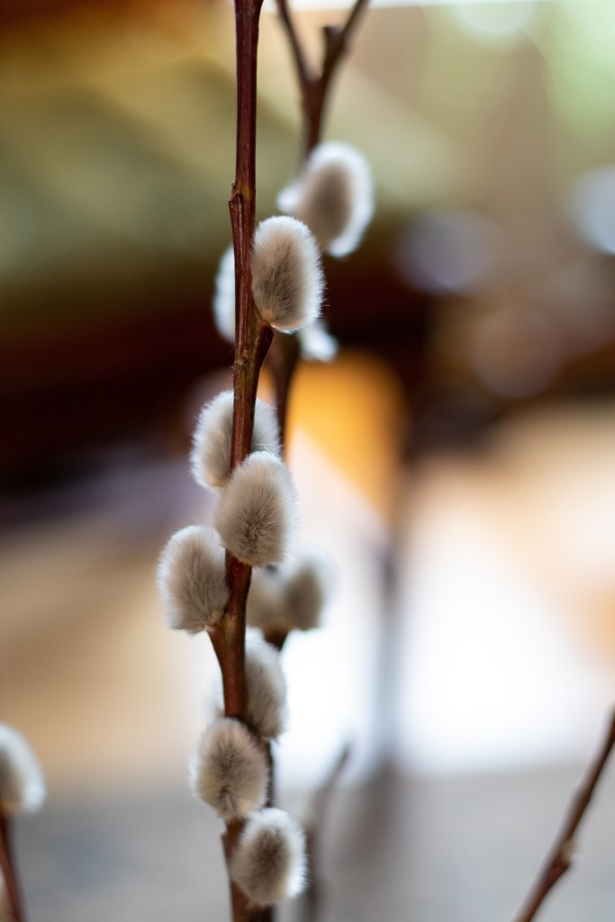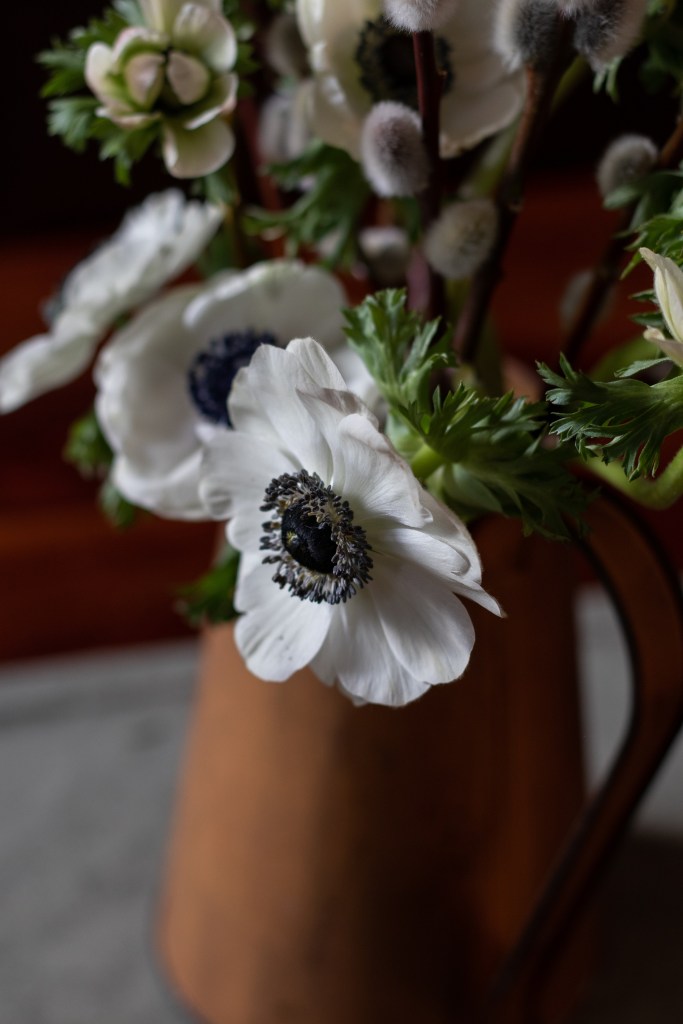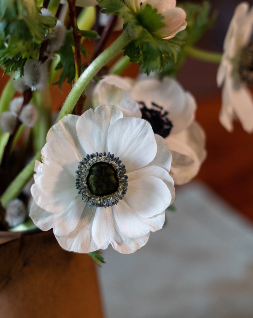 Jos keltainen ei ole sun juttu, niin valkoinen kruunuvuokko on mun mielestä todella kaunis keväinen vaihtoehto. Siinäkin on luonnonkukkamaisuutta ja se sopii hyvin yhteen pajunkissojen kanssa. Ihanan raikas yhdistelmä!