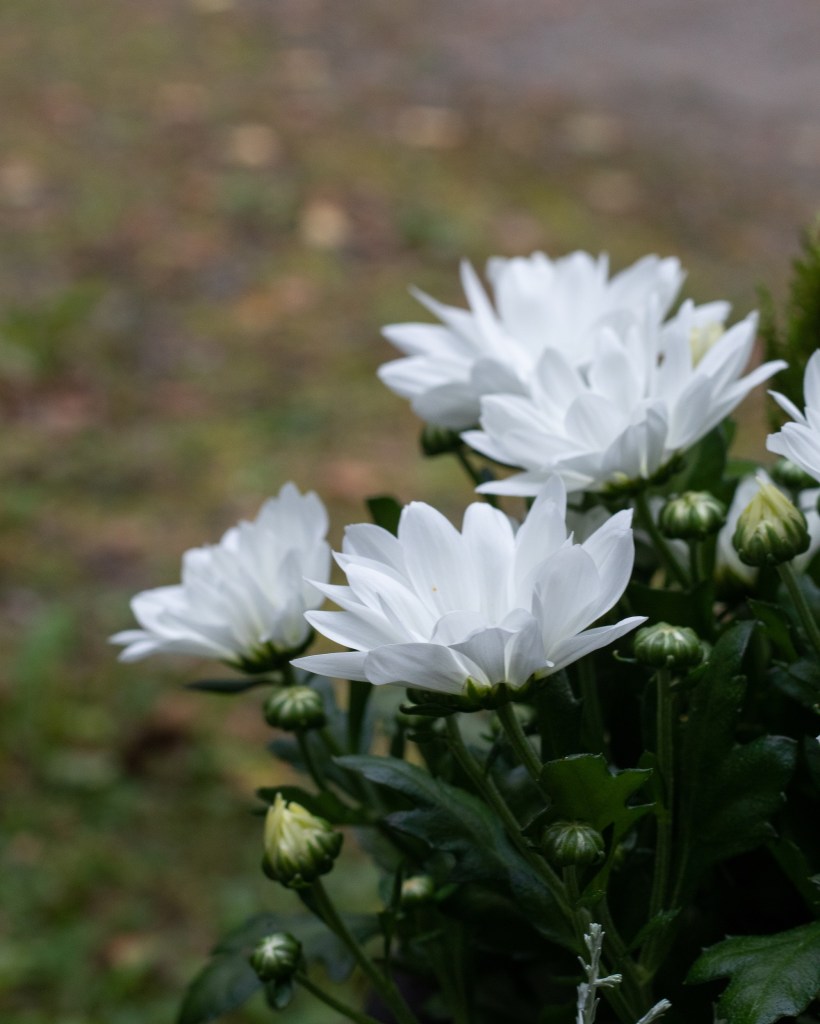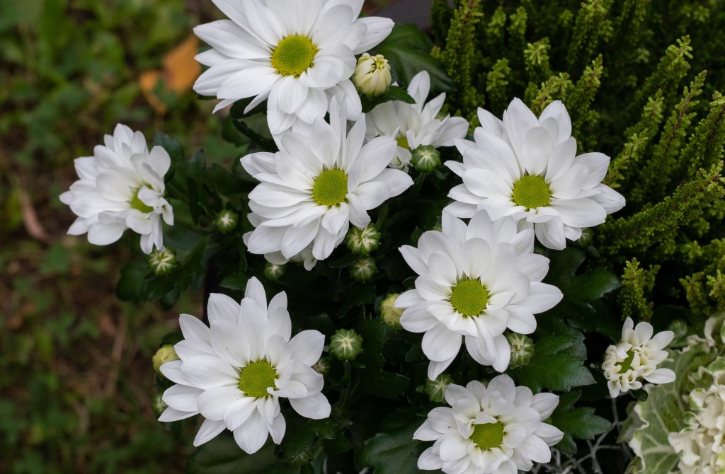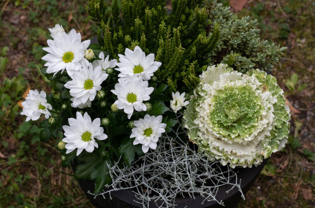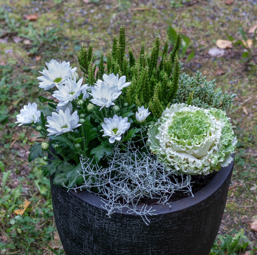 Valitsin tähänkin ruukkuun krysanteemin, valkoisena. Sekin kestää viileää säätä ja saatavilla on runsaasti värivaihtoehtoja.