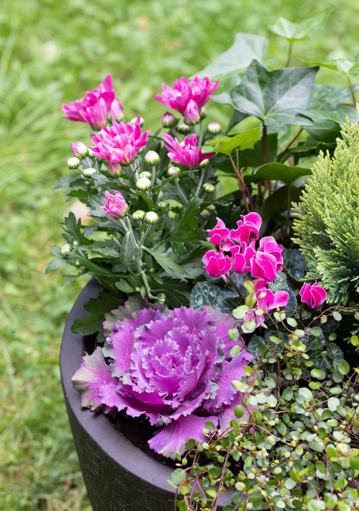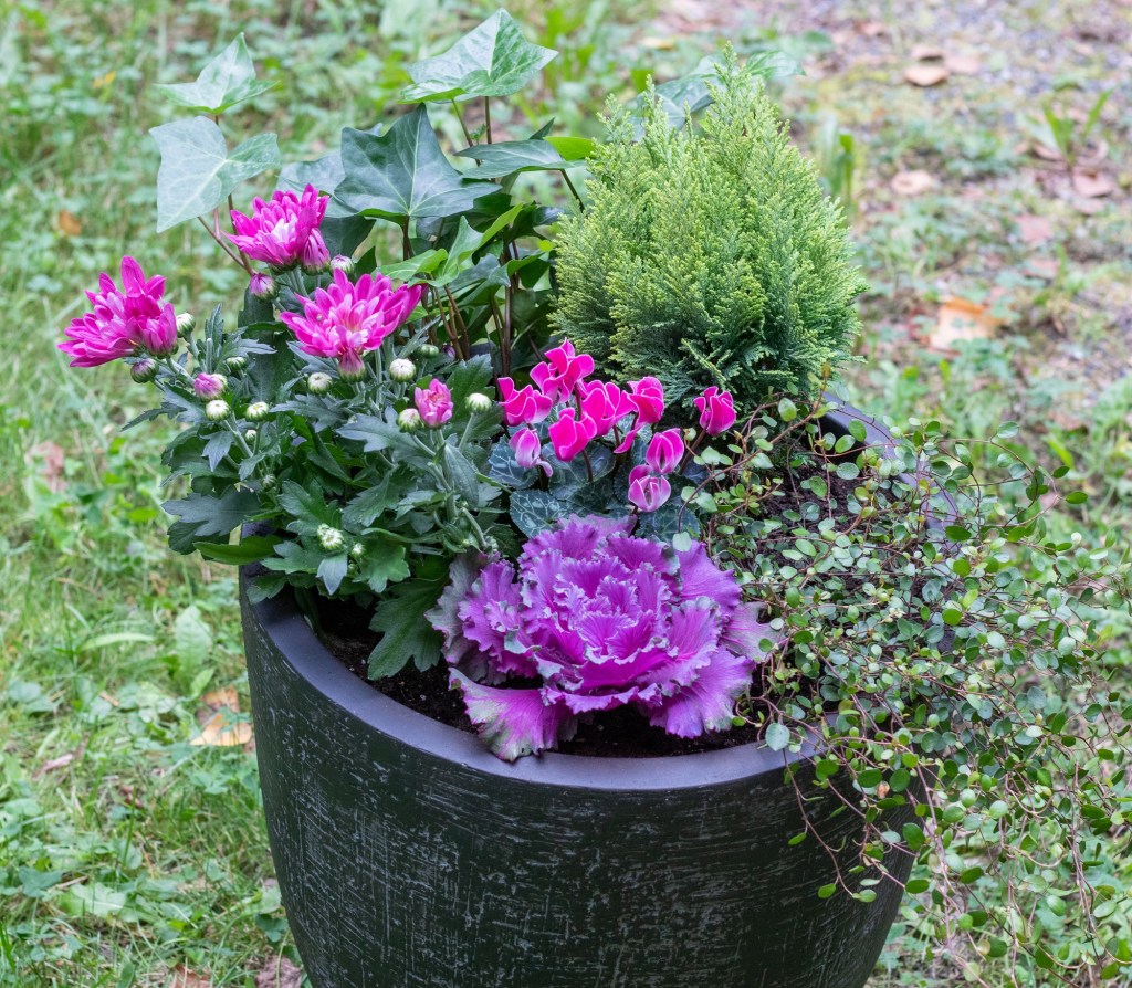 Istutin isompaan ruukkuun krysanteemin, syklaamin, koristekaalin, muratin, sypressin ja lankaköynnöksen. Syksyn kasveja voi istuttaa tiiviimmin kuin kesän, kun kasvua ei syksyllä ole enää pahemmin tulossa.