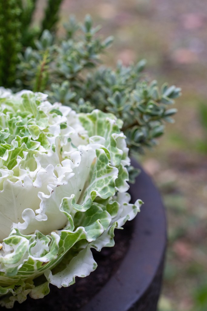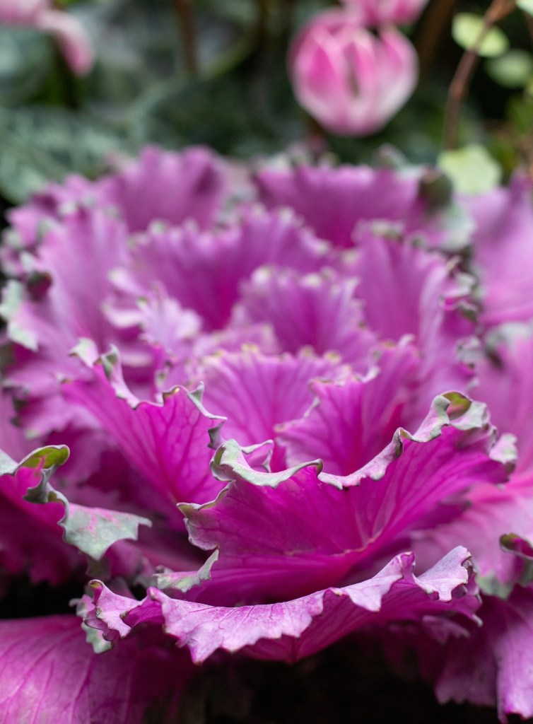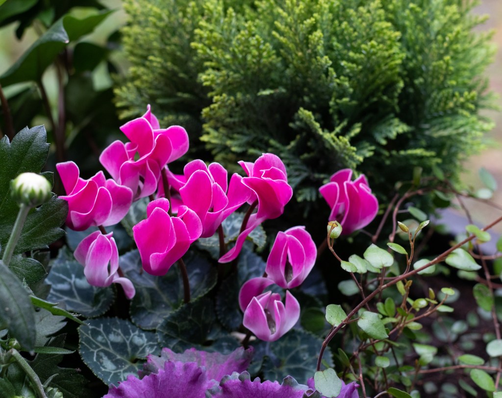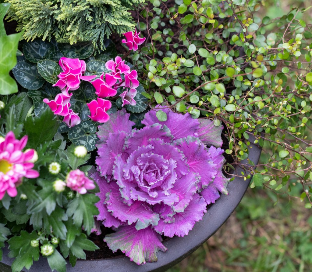 Mä tykkään koristekaaleista todella paljon ja istutinkin niitä eri värisinä molempiin ruukkuihin. Ne viihtyvät auringonvalossa ja kestävät hyvin viileää säätä. Muratin kauniin muotoiset lehdet eivät pientä pakkastakaan säikähdä ja sen voi saada talvetettuakin ulkona. Kirkkaan pinkki syklaami tuo ihanasti väriä ja sillä on myös tosi nätit hopeanhohtoiset lehdet.