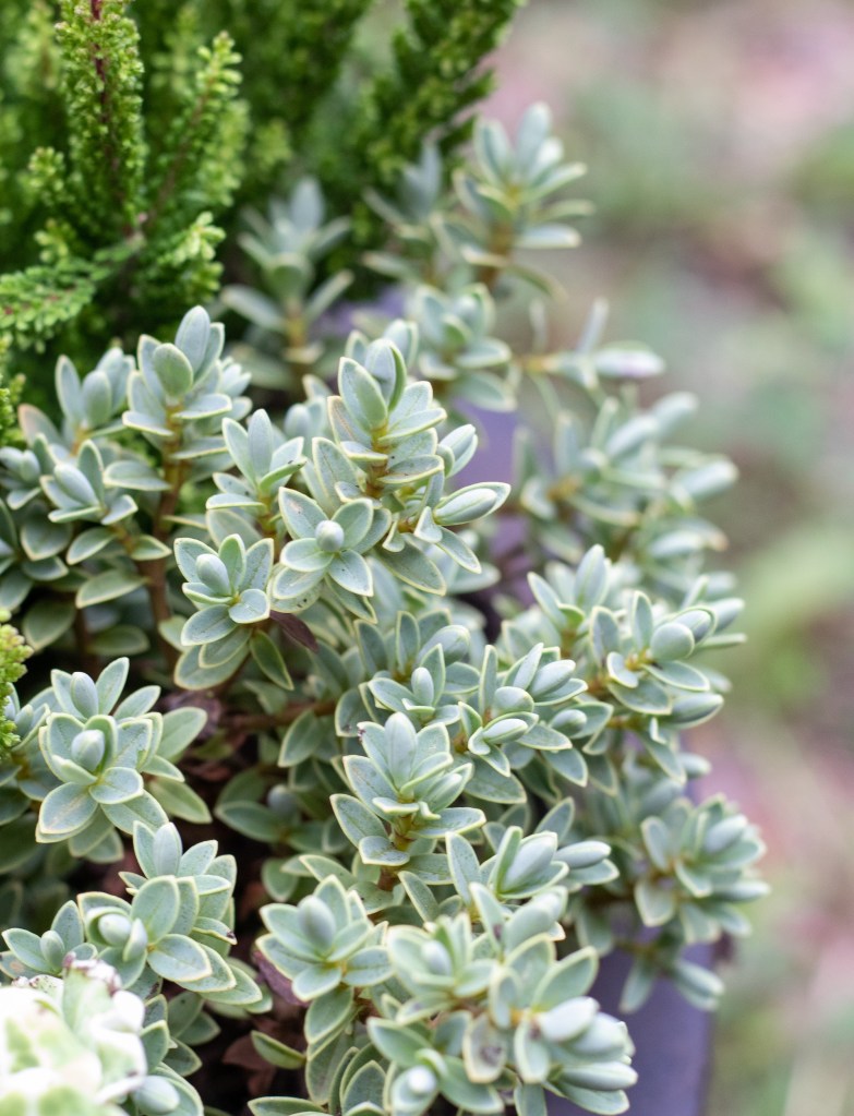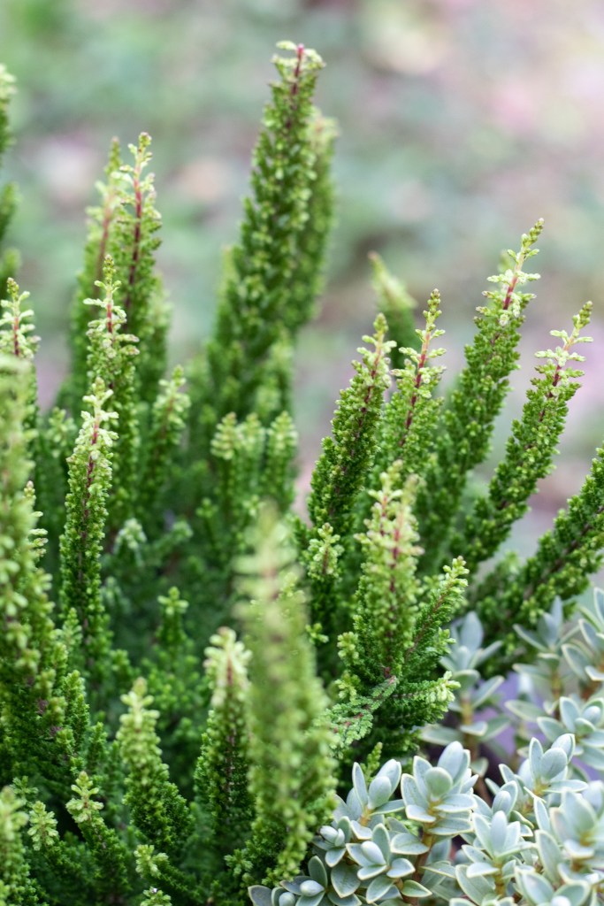 Viileän vihreä pensastädyke täydentää kivasti tämän raikkaan ryhmän. Senkin pitäisi kestää pikkupakkaset ja sitä on saatavilla eri sävyissä.