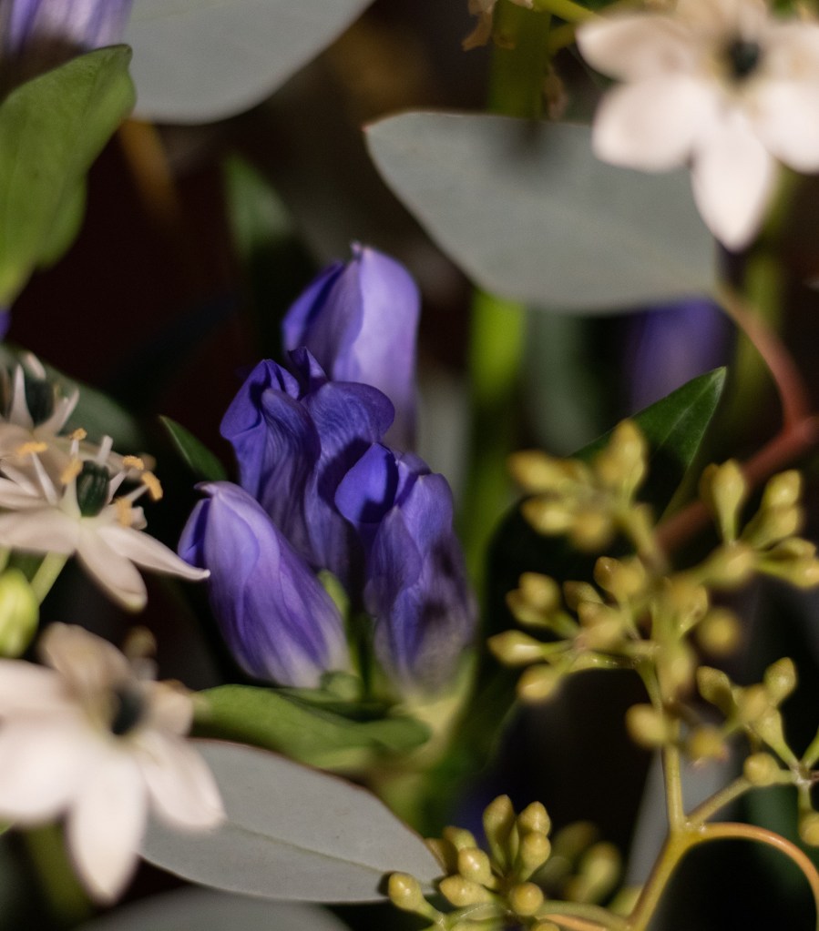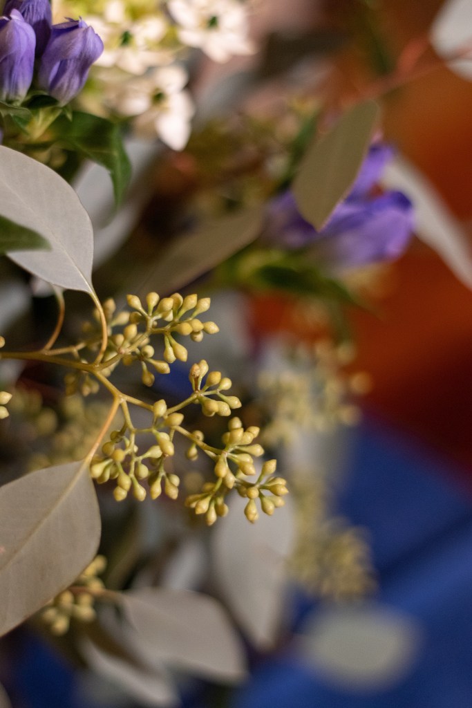 Kukkien seuraksi laitoin eukalyptusta. Eucalyptus Berryn oksat ovat nimensä mukaan marjoja täynnä ja tuovat asetelmaan runsautta. Tämä ja Eucalyptus nicholii (löytyy täältä) ovat mun mielestäni ihanimpia leikkovihreitä. Niiden tuoksu on raikas, muttei yhtään liian voimakas (nicholiin ehkä hieman voimakkaampi kuin berryn). Meille ei voi havuja tuoda allergian vuoksi sisälle, niin eukalyptukset tuovat kotiin hieman havumaista tuoksua joulun aikaan.