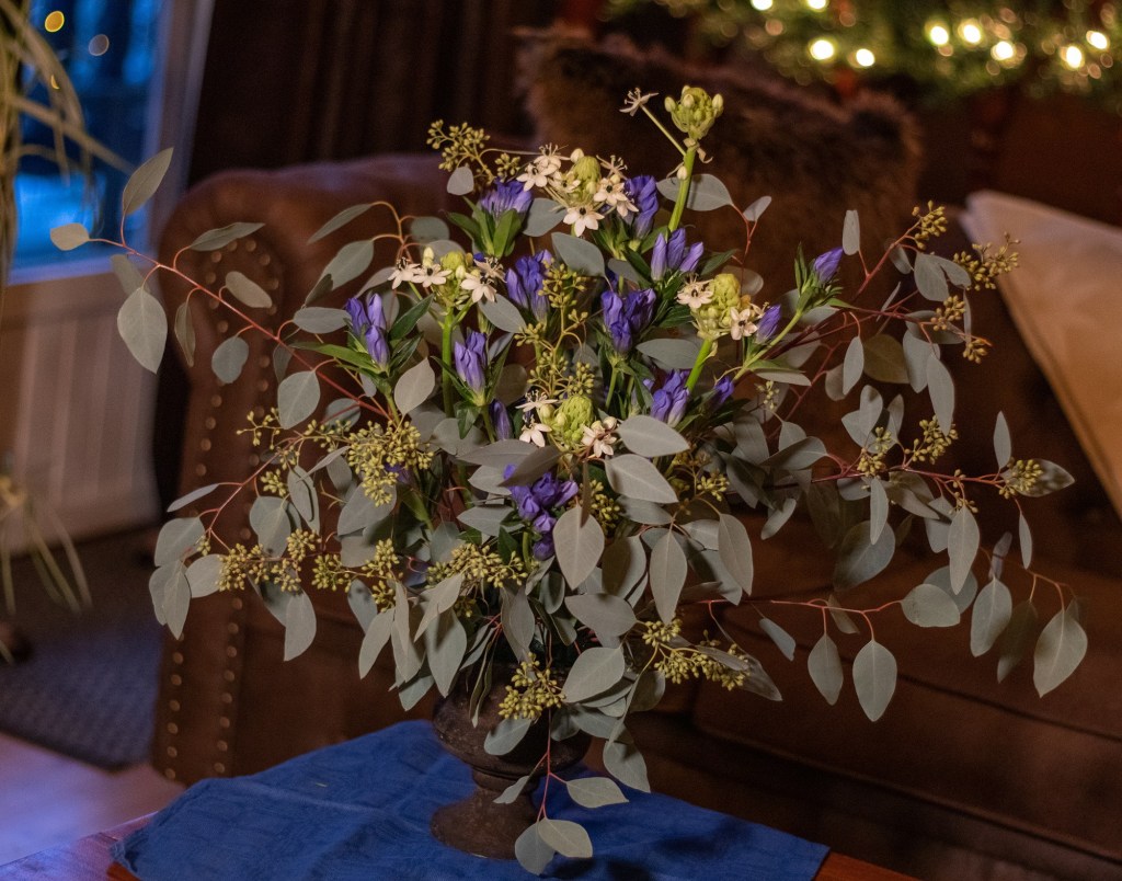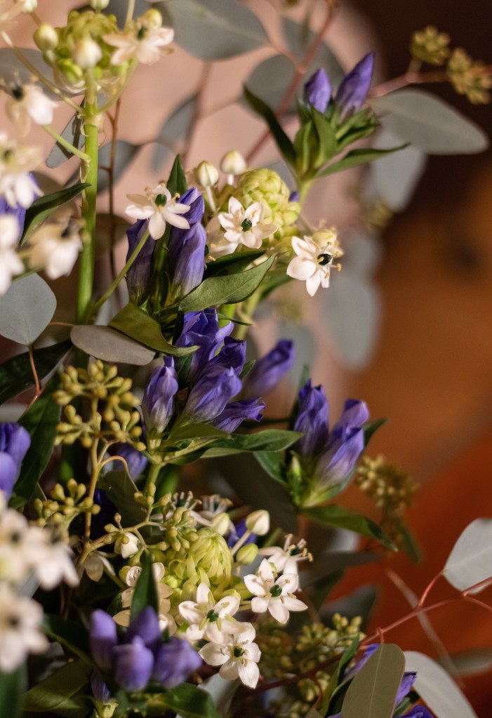Mä päätin tänä vuonna juhlistaa Suomen itsenäisyyspäivää sinivalkoisella kukka-asetelmalla. Myönnettäköön, että tämä on ensimmäinen kerta. Kynttilöitä on aina poltettu ja jotain pientä koristetta laitettu pöytään, mutta tämä on ensimmäinen itsenäisyyspäivän kukka-asetelmani. Mä en yleensä valitse kimppuihin ja asetelmiin pelkästään sinisiä ja valkoisia kukkia, joten otin tämän ikään kuin pienenä haasteena.