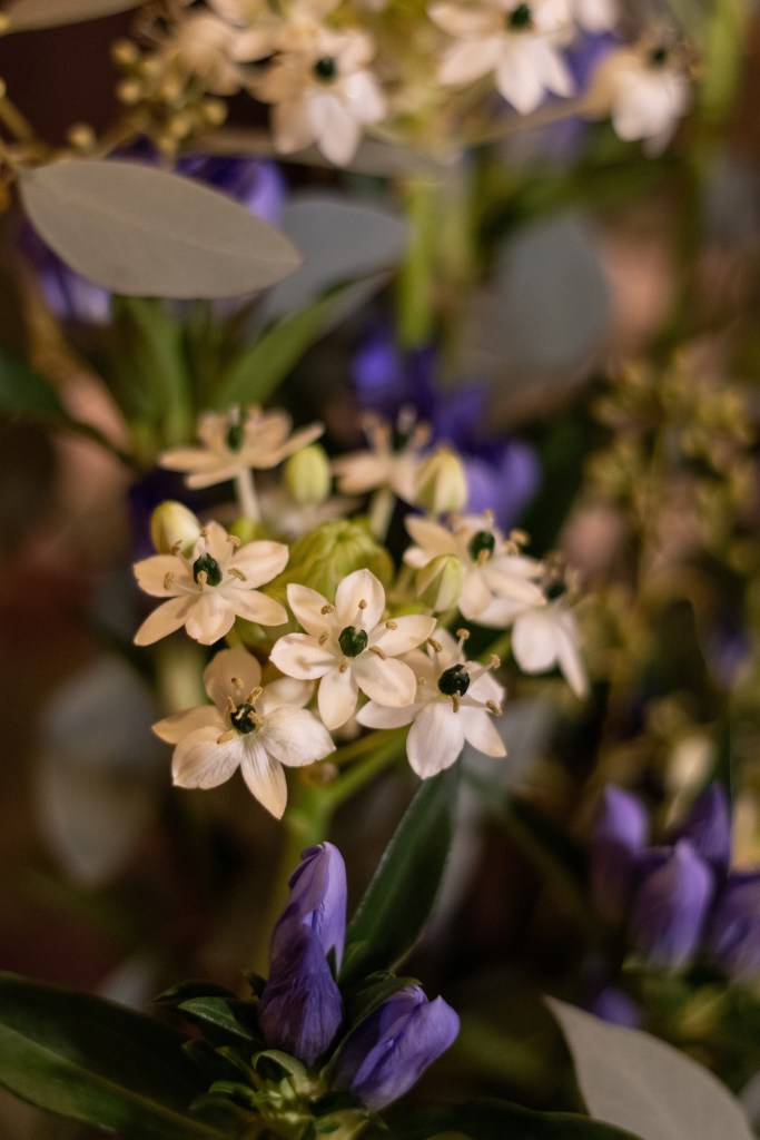 Valkoisiksi kukiksi valitsin suloisia afrikantähdikkejä. Ne ovat pitkävartisia ja todella näyttäviä leikkokukkia (mukulakasvi, sopii myös huonekasviksi). Leikkasin niiden varsista noin puolet pois eli, jos haluat tehdä oikein korkean kimpun tai asetelman, on afrikantähdikki hyvä vaihtoehto. Ne myös kestävät pitkään maljakossa. Beetlehemin tähdiksikin niitä kutsutaan, joten sopivat hyvin joulun aikaan.
