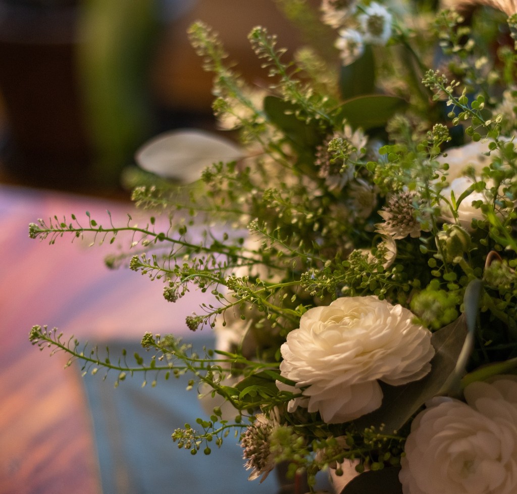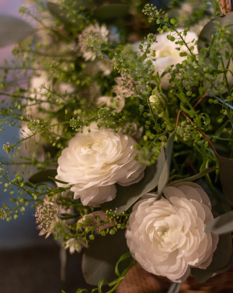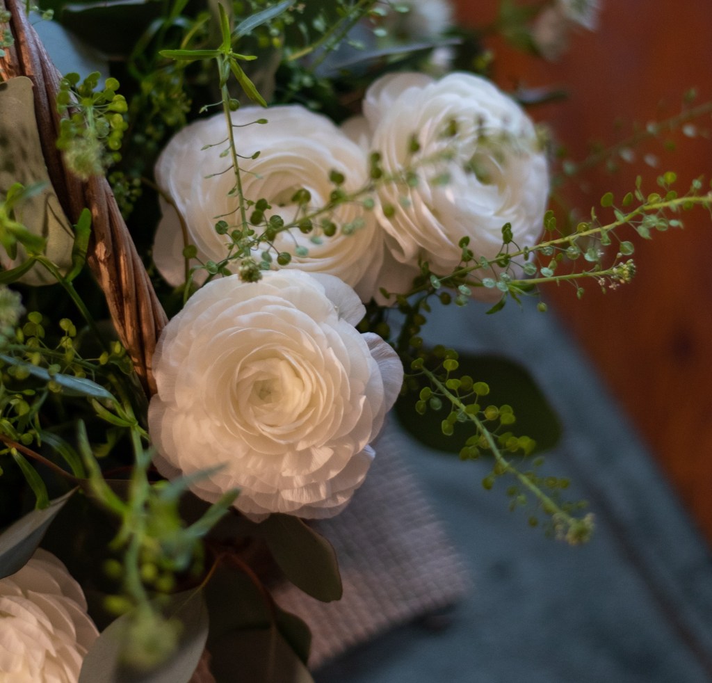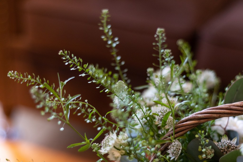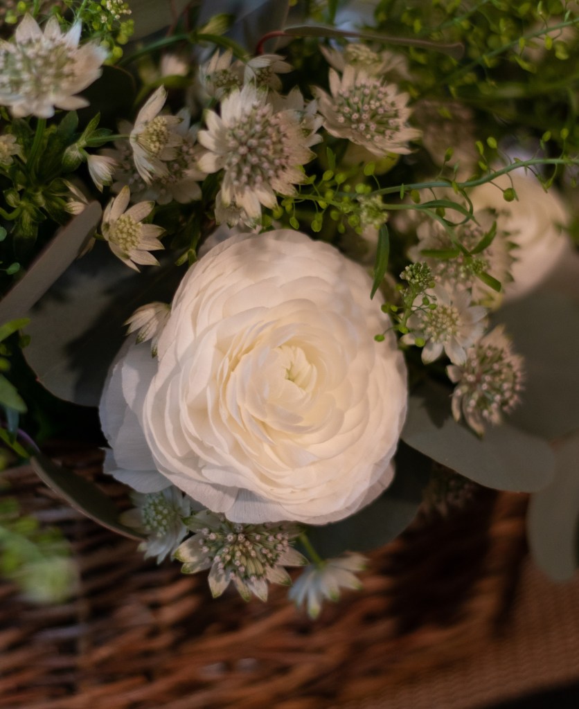 Kasveiksi valitsin jaloleinikkejä, isotähtiputkia, taskuruohoa ja eukalyptusta. Vain vihreää ja valkoista, mikä on mulle vähän outoa. Tähtäimessä siinsi seesteisen keväinen asetelma, joten päätin kokeilla tällaista yksinkertaista yhdistelmää tällä kertaa.