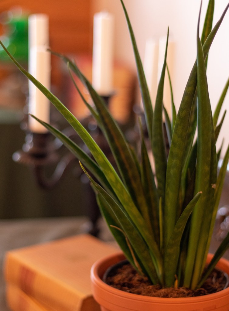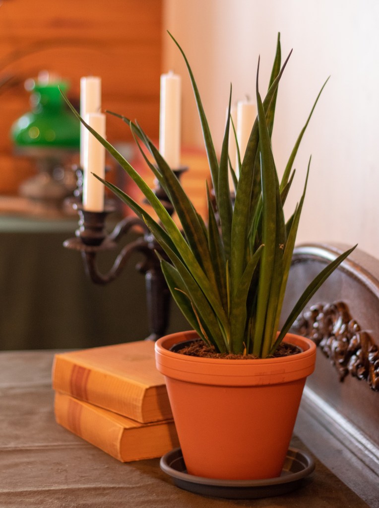 Anopinkieliä on monenlaisia. Tämä Huiskulasta saapunut kaunokainen on Sansevieria kirkii Friends. Tämä ei kasva niin korkeaksi kuin isoanopinkieli ja kasvutapa on kapeampi kuin keihäsanopinkielen, joten tämä sopii hyvin ahtaaseenkin paikkaan. Se tuo lisää ihanaa vehreyttä hämyiseen takkahuoneeseen, missä monet muut huonekasvit eivät viihdy.