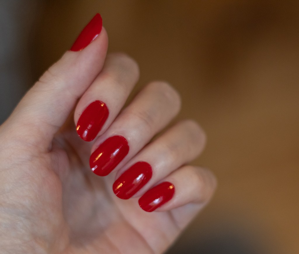 Täydellinen kirkas punainen! Sopii mun mielestä nätisti hyvin vaaleaankin ihonsävyyn. Lämmin, hillitty, täyteläinen. Hyvin peittävää jälkeä saa jo yhdellä kerroksella, mutta laitan silti yleensä kaksi. Tämä lakka kuivuu hieman nopeammin kuin edelliset. Tuoteselosteessa luvataan, että vain 40 sekuntia menee ja kyllä se tuntui aika lailla paikkansa pitävän. En ihan sekunnilleen ole kellottanut, mutta sanoisin, että noin minuutissa on ensimmäinen kerros kuivunut niin, että voi levittää toisen kerroksen. Lopputulos on geelimäisen kiiltävä, mistä tykkään tosi paljon!