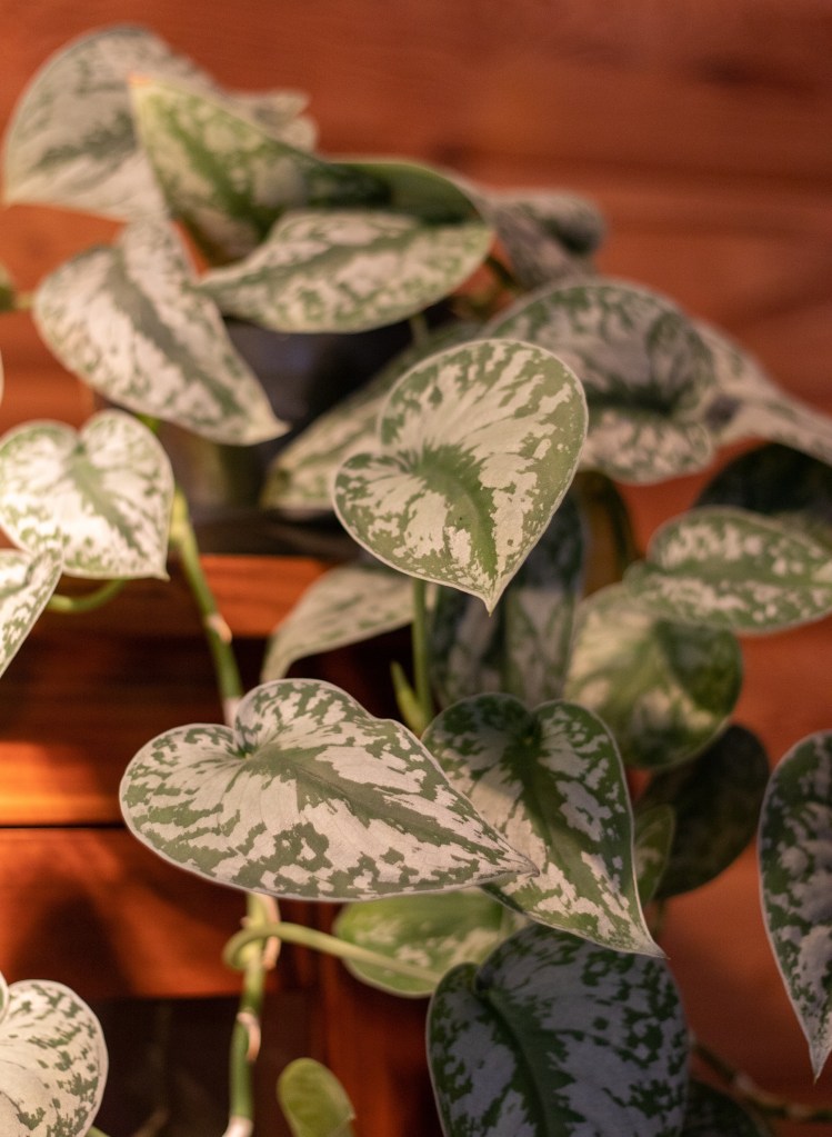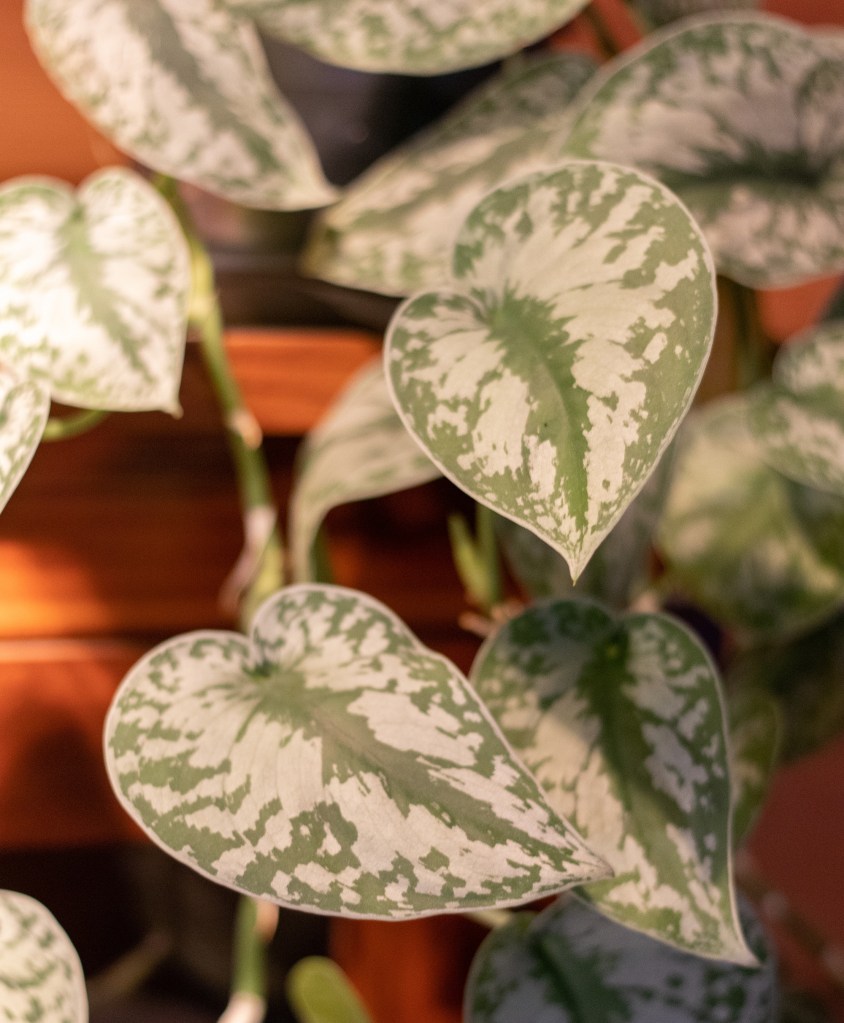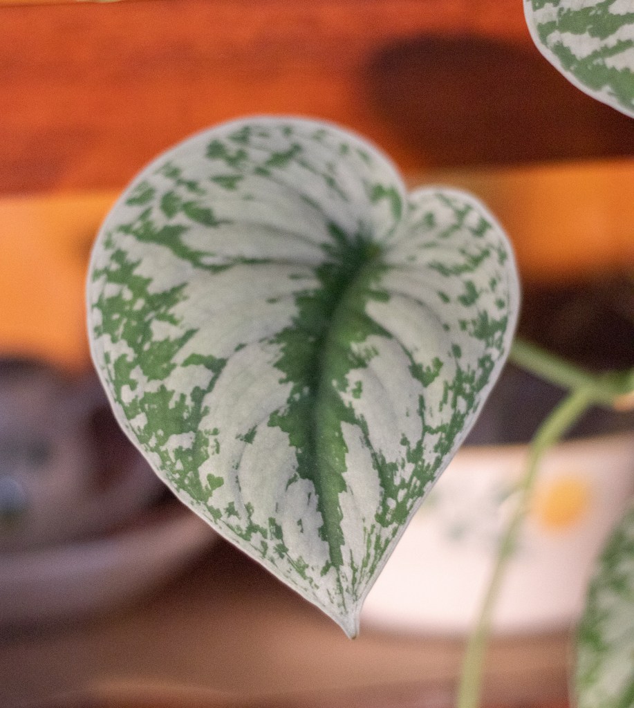 Hopeaköynnöksen kauniinmuotoisissa lehdissä todellakin on hopeista hohtoa nimensä mukaisesti. Lehtien koko riippuu tietysti valon määrästä, kuvan hopeaköynnöksen isoimmat lehdet ovat suurinpiirtein mun käteni kokoisia. Se on aika varjoisalla paikalla olohuoneen perällä, mutta saa lisävaloa spottilampusta. Mistään kirkkaasta kasvivalosta ei ole kyse, vaan ihan tavallinen lämpimän sävyinen valo (710 lm, 2700K).