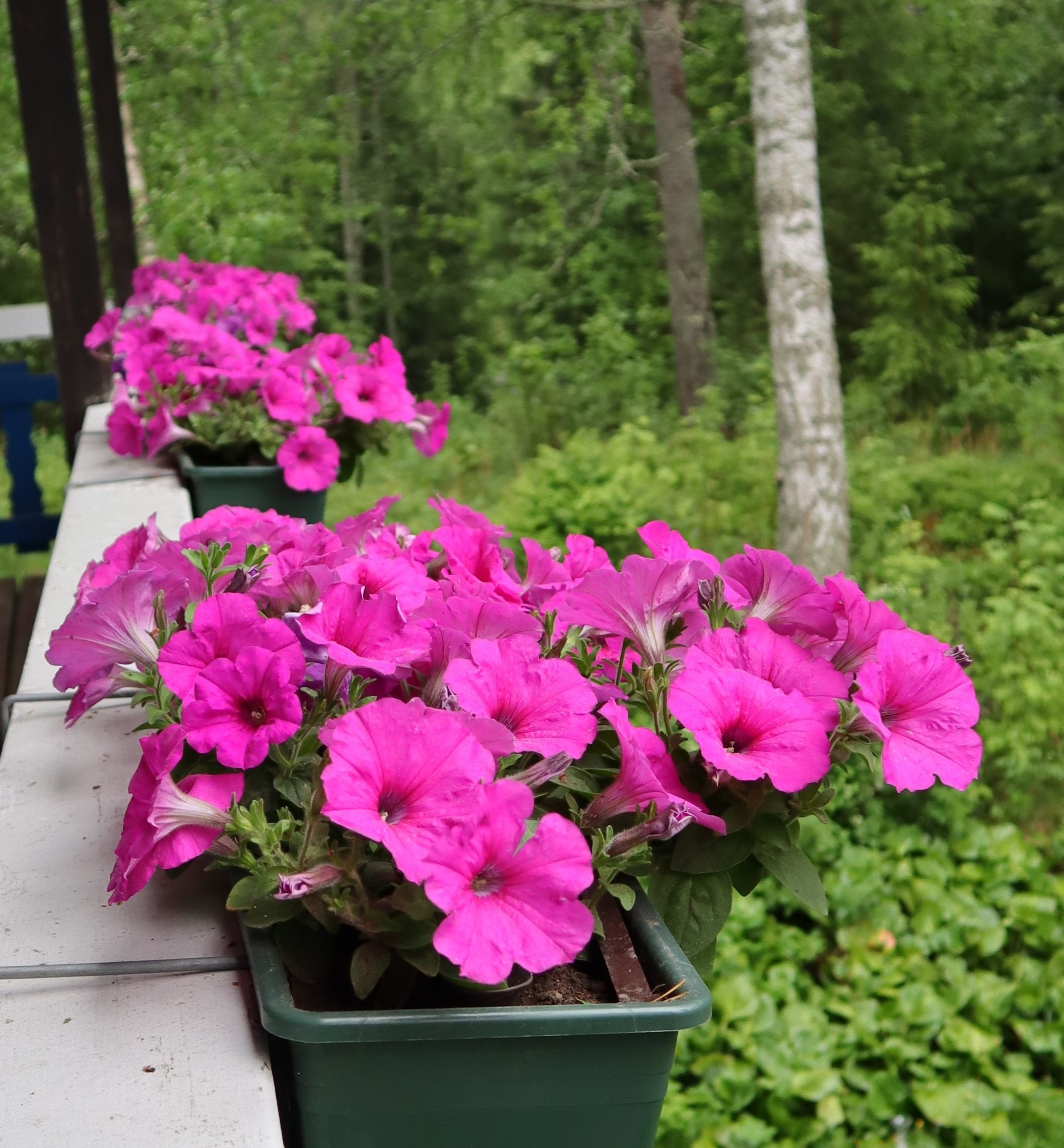 Seuraavien kuvien Tidal Wave Cherry -petuniat ovat olleet vieläkin voimakaskasvusempia kuin Red Velourit ja valtaavat upeasti lähes koko parvekkeen.