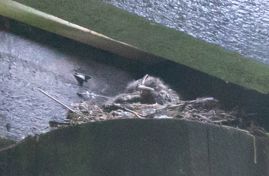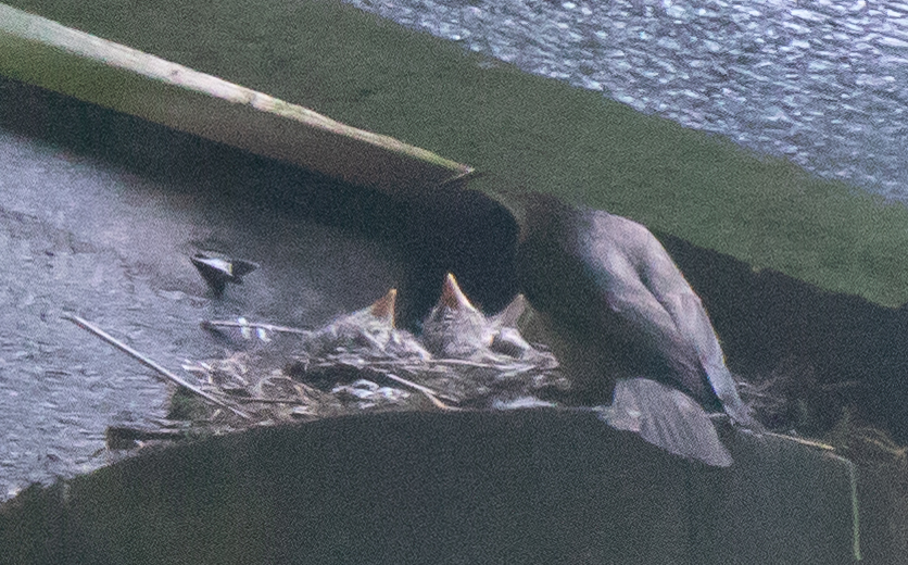 Välillä emo jäi siivoamaan pesää ja vei ulosteet pois. Poikaset tekivät siivoamisen helpoksi, kun tekivät tarpeensa pesän reunan yli hirren päälle.