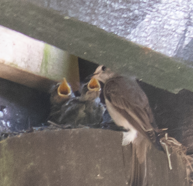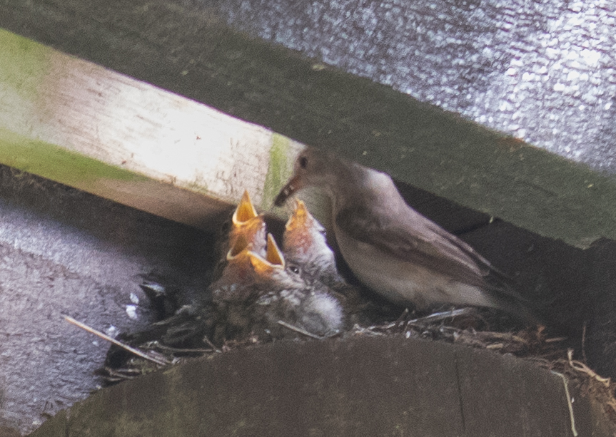 Tänä kesänä harmaasiepot olivat huomaamattamme rakentaneet pesän parvekkeen lattian alle hirren päälle, minne on alakerran huoneesta suora näkyvyys. Me vietetään paljon aikaa parvekkeella ja mä olin kulkenut ihan pesän yläpuolella istuttaessani petunioita, mutten ollut huomannut pesänrakennuspuuhia ollenkaan. Ihmettelin kylläkin, miksi harmaasieppo kyttää läheisen koivun oksalla aina, kun menen parvekkeelle. En siinä vaiheessa tajunnut, että se vartioi naaraan hautoessa munia. Huomasimme pesän vasta siinä vaiheessa, kun poikasia oli jo kuoriutunut ja lattialautojen välistä alkoi kuulua piipitystä. Harmaasiepot tulevat täällä rohkeasti ihmisten lähelle, mutta olin silti yllättynyt pesän sijainnista.