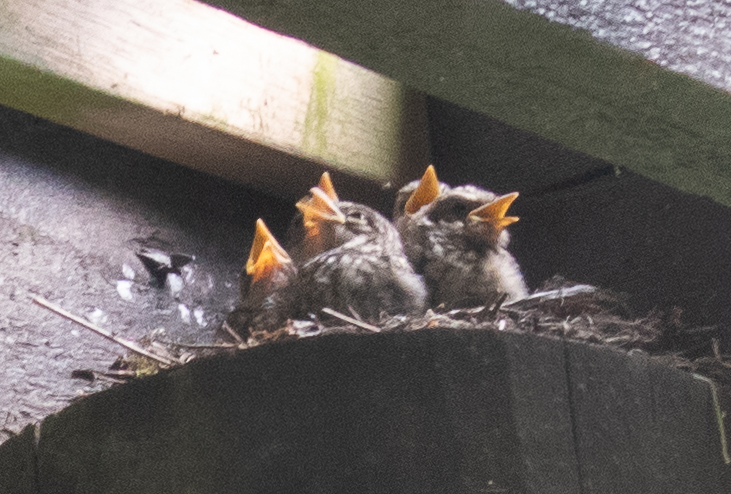 Poikasten nokat aukesivat heti, kun lähettyvillä varjo vilahti ja odottivat jomman kumman vanhemman saapuvan ruokalähetyksen kanssa. Ruokintatilanteesta oli senkin takia vaikeaa saada hyviä kuvia, kun ruokinta tapahtui aina todella nopeasti. Mietinkin, että miten vanhemmat oikein pitävät huolen siitä, että kaikki poikaset saavat sapuskaa. Näytti siltä, että ne tiputtivat annoksen todella pikaisesti johonkin nokista sen enempää pohtimatta. Samaa tahtia näyttivät kaikki tiput kuitenkin kasvavan, joten hyvin ne homman hoitivat.