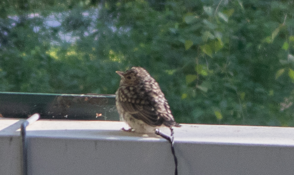 Meillä kävi hyvä tuuri, kun satuttiin näkemään ensimmäisen tipun pesästä lähtö. Oletettiin, että poikaset lennähtävät pesästä maahan, mutta ne kipusivatkin parvekkeelle lautojen välistä. Ensimmäinen lähtijä lennähti kaiteelle ja ihmetteli sieltä maailmaa ensimmäisen kerran. Ja huusi! Vähän huolestuineina seurattiin, miten tipusen käy, mutta hienosti siivet kantoivat ja matka jatkui pian vauhdikkaasti talon katolle.