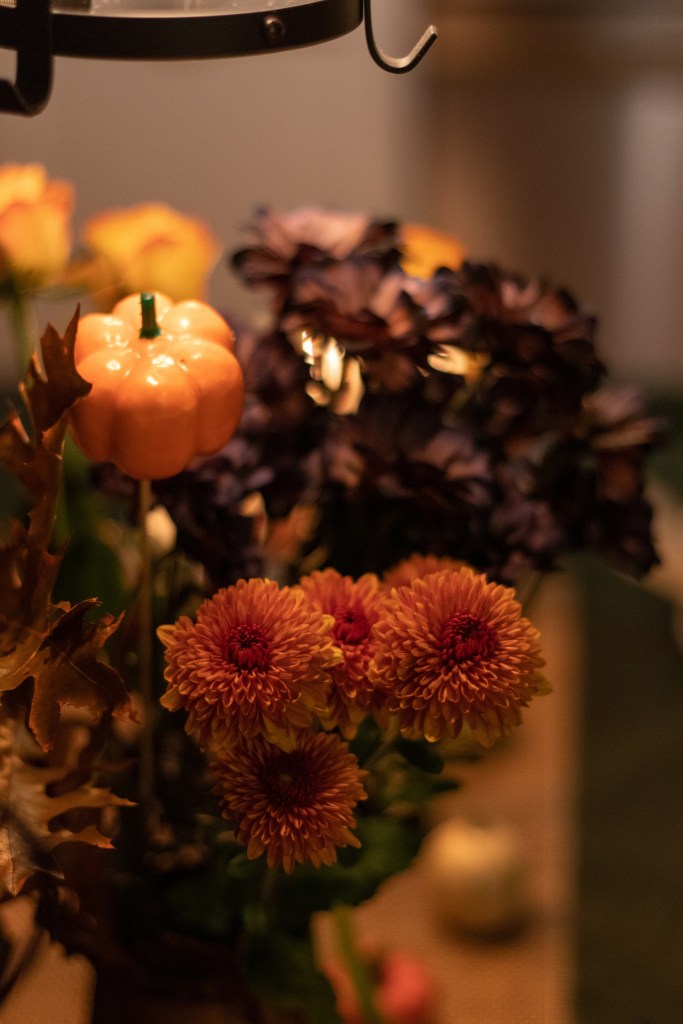 Juhlapöytää koristi kaupan nätti valmiskimppu, missä oli krysanteemeja ja ruusuja. Ruusut ovat aina ihania, mutta taas tuli todistettua miten paljon pidempään varsinkin nuo pikkukrysanteemit kestävät maljakossa. Niin kaunis tuo ruosteinen sävykin.