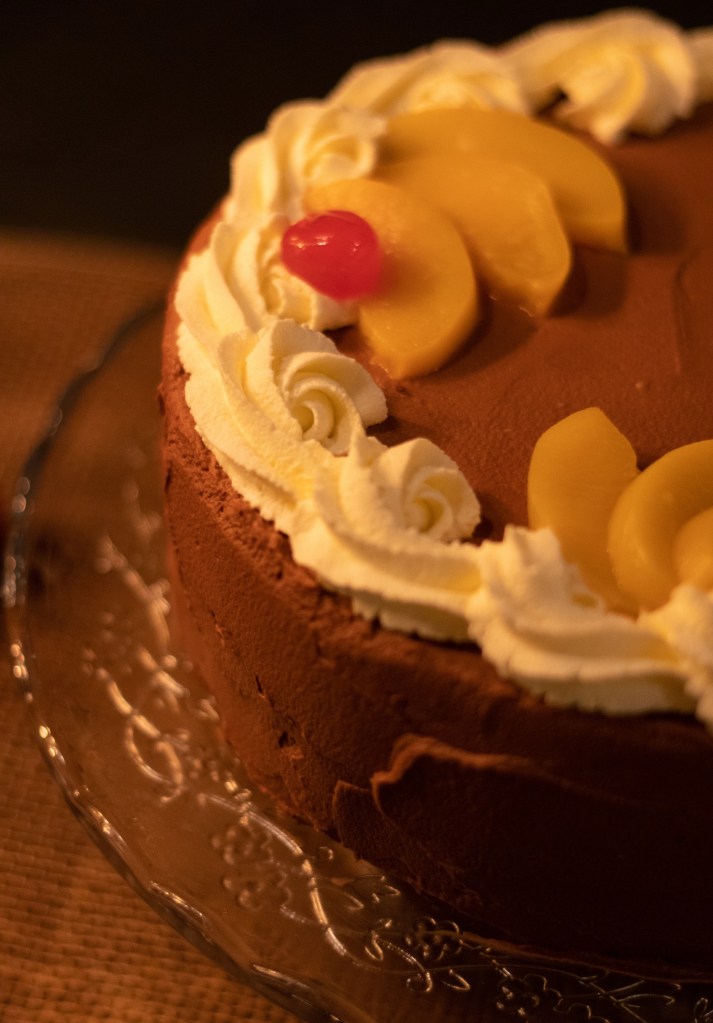Kakun leivoin juhlapöytään itse niin kuin aina ja jälleen kerran tällä reseptillä. Tumma kakkupohja, väleissä aprikoosimarmeladia ja suklaamoussea. Päällä lisää moussea, kermavaahtopursotukset ja koristeena mitä milloinkin sattuu kaapeista löytymään. Tästä kakusta tuli jotenkin niin retro, kun koristelin sen pelkästään persikan siivuilla ja kirsikoilla. Tuli ihan 80- ja 90-luvun täytekakut mieleen. Mulla onkin ollut mielessä leipoa kunnon retrokakku. Sellainen kermakakku, minkä väliin tulee kermavaahtoa ja mansikkaa tai banaania. Tai kerman tilalle vaniljakastiketta. Ja päälle paljon värikkäitä hedelmiä. Nykyään kun on muodissa koristella kakut kaikenlaisilla hörhelöillä, niin harvemmin näkee ihan vain hedelmillä koristeltua täytekakkua. Mä en muuten ihan sitä trendiä ymmärrä, että kakun päällinen ladotaan täyteen syömäkelvottomia kukkia. Näyttäväthän ne todella kauniilta ja saa upeita kuvia, mutta kukat pitää poistaa ennen kuin kakusta voi leikata. Kyllä mäkin tykkään koristeita näperrellä, mutta yksinkertaisuuskin toimii välillä. Mä en tykkää kovin makeasta ja sen takia käytän kakuissa harvoin sokerimassaa, sokerikreemiä tai marsipaania, Niistä saisi kyllä upeita koristeita, mutta mä leivon maku edellä. Tuohon mun ohjeen suklaamousseen ei tule sokeria ollenkaan (tummassa suklaassa sitä kun jo on). Kermavaahtoon en myöskään lisää sokeria koskaan. Tässä kakussa aprikoosimarmeladi tuo ihan tarpeeksi makeutta.